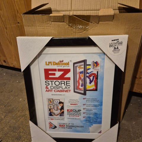 «Genial bilderamme for opptil 50 kunstverk / A4 ark. Nå kan du tømme kjøleskapsdøren og stueveggen for tegninger, og oppbevare både bilder, kunstverk, tegninger og malerier i denne flotte bilderammen, som enkelt åpnes på framsiden som gjør det enkelt å ta ut og sette inn ytterligere tegninger.»