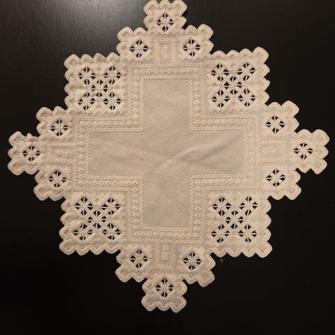 Flott håndarbeid i hvit, solid bumull, med blondebord rundt hele kanten.