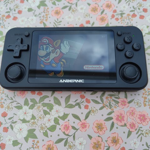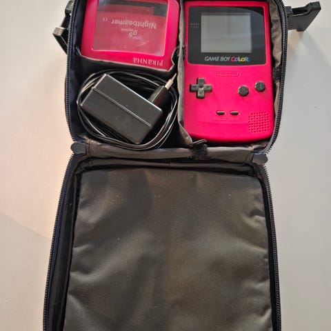 Annet bærbar spillkonsoll i rød farge med innebygd skjerm og kontrollknapper. Konsollen leveres med oppbevaringsetui i svart materiale. Egnet for bærbar bruk og spill underholdning.
