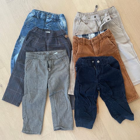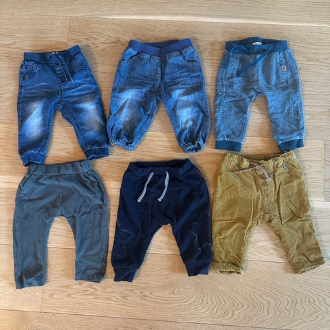 Barneklær Bukser i størrelse 68 for gutt. Bukser i flere forskjellige farger og mønstre, laget i ulike materialer. Passer for små barn og kan brukes til daglig bruk. Litt blandet merker fra Hm, babygap og Disney baby.