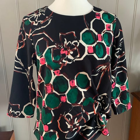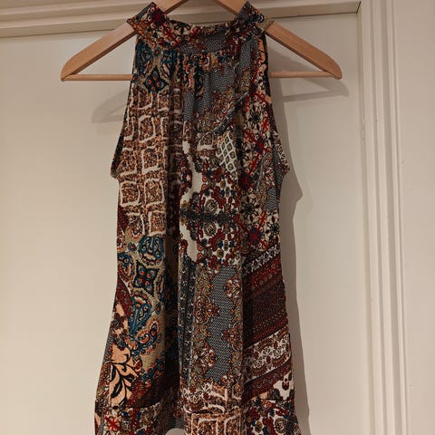 Lett of luftig topp fra Summun Woman Amsterdam. 100% viskose og A-form. Toppen er off-white, med mønster i høst-farger. Lappen henger på - med pris 599kr.