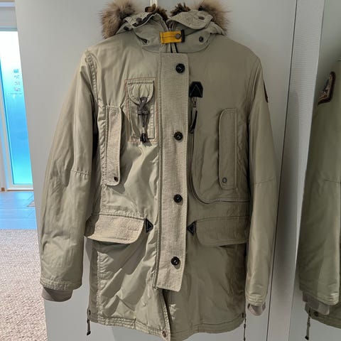 Parajumpers Annet yttertøy for kvinner i størrelse S. Jakken er beige og har et fôr med dunfyll. Den har hette med pelskant og er designet for utendørs bruk.