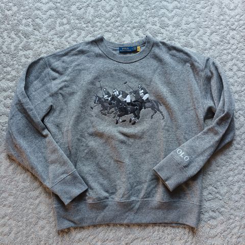 Ralph Lauren genser for kvinner i størrelse M. Genseren har flerfarget design med røde og hvite striper og metallknapper på skulderen. Laget i mykt materiale, egnet for daglig bruk.