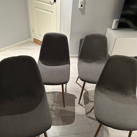 Selger seks stoler av 1 1/2 år gamle, selges samlet, den ene stolen ble stående inntil eldre panelovn og fikk noen merker som vist på bilde, derfor ny pris