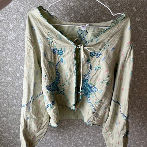 YAS bluse og skjørt sett i størrelse XL for kvinner. Settet består av en grønn bluse med mønstret stoff og et matchende grønt skjørt med rysjedetaljer. Materialet er lett og gjennomskinnelig med elastiske detaljer i midjen og ermene. Når settet brukes sammen ser det nærmest ut som en kjole.💚