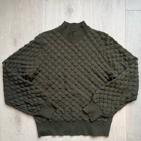 Grønn/turkis strikkegenser med fine detaljer.