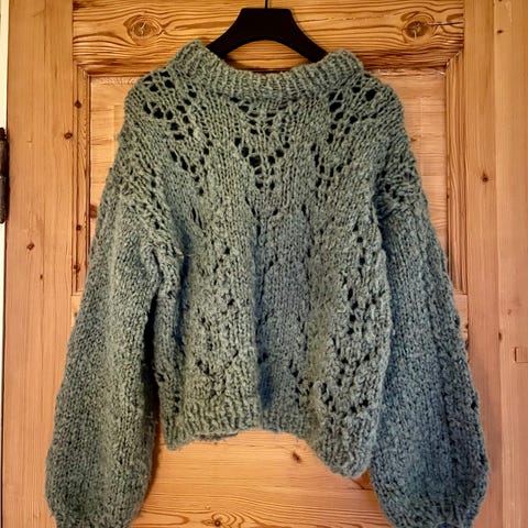 Pen strikkegenser med fine detaljer. Sennepsgul. Passer strl small til medium. Kun brukt et par ganger.