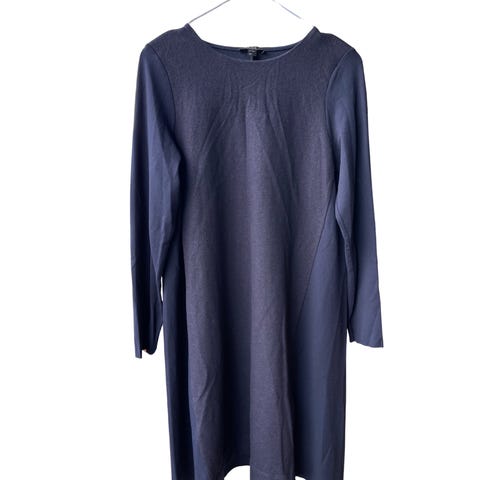 Kjoel i navyblue og hvit. To stoff: topp er 'strikket' i polyester med 3% elastane. Nedre del er det typisk 'skjorte' bomull og har splitt (med knapper) på begge sider. Kjolen har to sidelommer. Ingen bruksmerker, som ny.