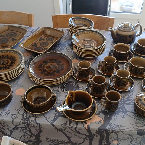 Produksjon ca. 1960–1965. Klassisk brun/oker steingodsdekor med svarte blomsterornamenter. Alle deler er i god stand uten nag eller skår. Eventuelle lyse felt på bildene er kun reflekser fra fotografering.