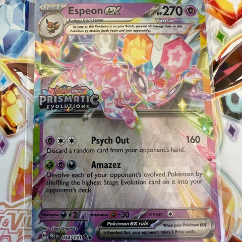 Hei hei, jeg selger ett Espeon EX promo pokémon kort ifra serien Prismatic Evolutions, året 2025
