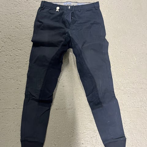 CRW Ridebukse i svart farge, laget av bomullsmateriale. Str 48. Meget god kvalitet. Nesten ikke brukt, kun 2-3 ganger. Buksen har forsterkede områder på knærne og en knappelukking i front. Designet for bruk ved ridning med god passform og funksjonelle detaljer. Lommer både foran og bak. Elastisk nederst ved anklene gir komfortabel og tett rundt støvlene. Også beltehemper for enkel bruk med belte.