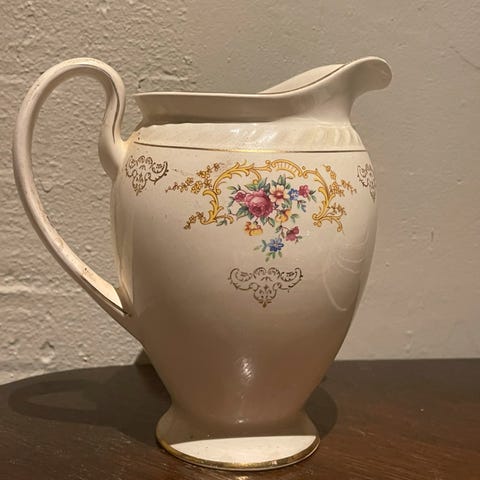 En kopp fra Porsgrunn porselen og to små tallerkener fra Stavanger flint .Serviset har dekorative figurer og er laget i keramisk materiale.