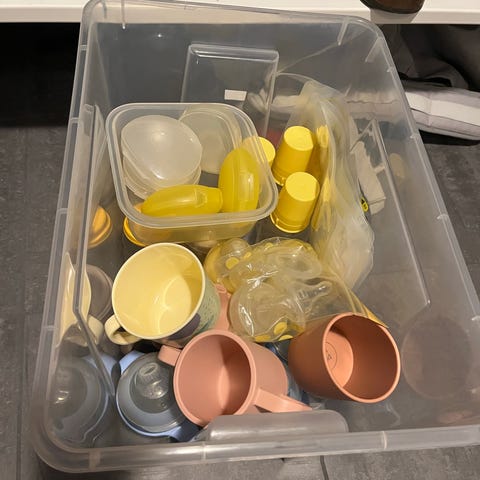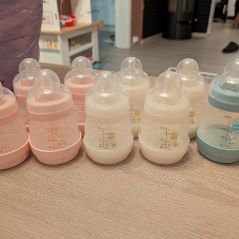 8 rosa flasker med tut nr 3 fra Mam og pulverbokser fra twist and Shake som kan bygges . Fant bare to av 3 lokk til disse boksene , de kan fylles med pulver og skrus på toppen av hverandre slik at en bare trenger et lokk om man er ute på tur så jeg har ikke tenkt så mye på det .