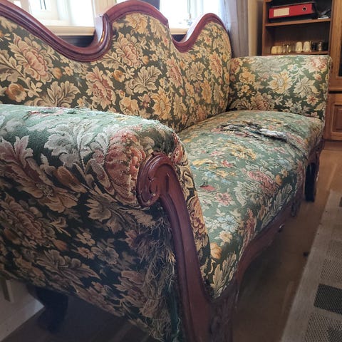 Ukjent tretelefonbenk med integrert oppbevaringsskap og polstret sittepute med mønstret stoff. Benken har et klassisk design med utskårne detaljer på ben og ryggstøtte. Oppbevaringsskapet har en dør med låsbar mekanisme. Passer til bruk som telefonbenk eller liten sitteplass med lagringsmulighet.