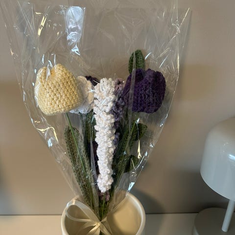 Jeg lager hekleblomster og har altfor mange hjemme. Derfor ønsker jeg å selge noen. Disse er er ville blomster i gul, rosa og aprikot. Kjempesøte å ha i en bukett eller enkelt for seg :) Jeg har 6 stykker hvor det er en åpen og en lukket blomst i ett. Og 1 med bare en åpnet blomst.