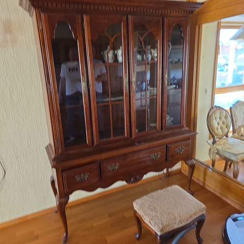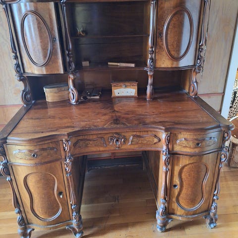 Sekretærskrivebord i eik, Sjelden antikk fransk utskåret byrå elegant med overskap.