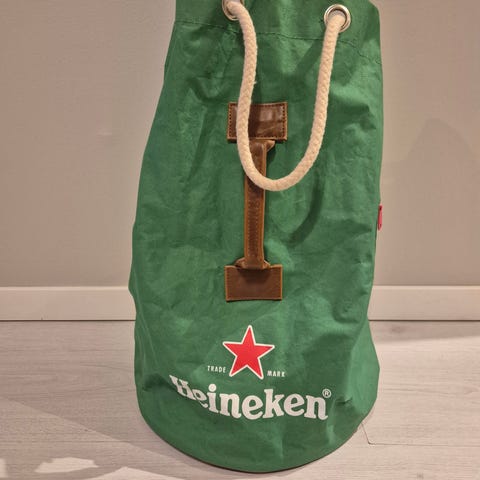 Veske lagd av Heineken-boks. Solid og holder fasongen. Den ble kjøpt i utlandet og jeg har ikke sett noen som har maken. Veska er liten og nett og passer kanskje best som pynteveske og til småting. Justerbar stropp følger med. Den kan også enkelt byttes for et annet uttrykk. Ser for meg at denne kan passe godt til heineken-entusiaster, ølentusister, oktoberfest eller andre anledninger.