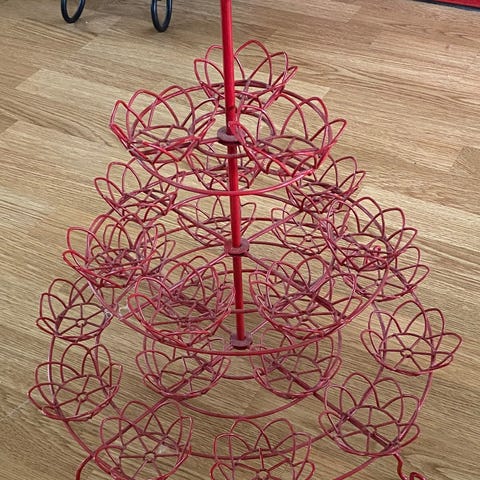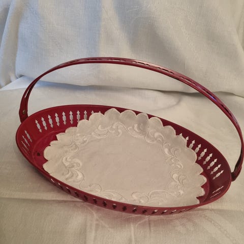 Selger vintage IKEA stettfat, fruktfat, etasjefat, etasjekurv. Den er pent og lite brukt, uten skader eller slitasje. Passer fint til grønnsaker, frukt, kaker eller annet, fantastisk rundt juletider. Målene på selve kurvene er 24 x 24 x 7 cm og hele stettefatet er 30 cm høyt opp til hank og 43 cm med hank.