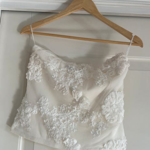 Bik Bok stroppløs topp i gul farge, størrelse M. Topp laget i blonder med dyp V-utringning og åpen rygg.
