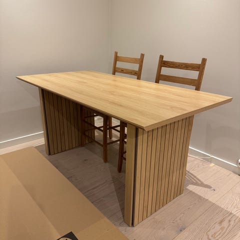 Veldig pent spisebord fra Bohus kjøpt i desember 2023. Lite og pent brukt. Denne finnes ikke lengre på nettsiden, men materialet og utseende er ganske likt som spisebordet de nå kaller Stryn. Diameter på bordet er 120 cm. Spiler nederst som festes med borrelås. Må hentes på Skedsmokorset ☺️