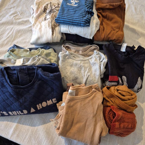 Klærne er godt brukte, men fremstår pene. Jeg fant ingen hull eller flekker men tar likevel forbehold om små bruksspor.