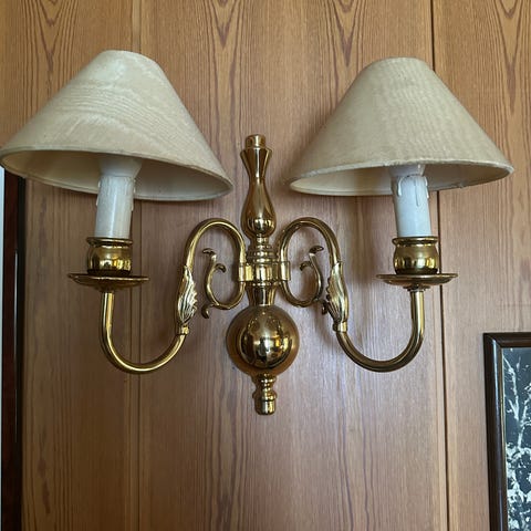 Blank messing. Tre svinelær skjermer følger med. Klassisk og vakker. 27 cm mellom hver lyskilde. Sendes mot porto.