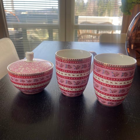 Se mine andre annonser. Har ute en tekopp med grått rosemønster også, til samme pris.