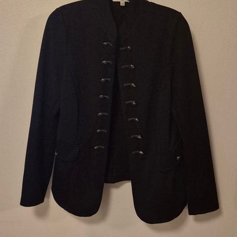 Rød og grårutete jakke med fòr. Fine detaljer. Ullblanding.