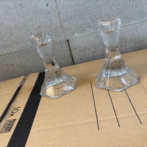 Fine lysestaker med krystaller hengene på selges samlet.