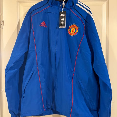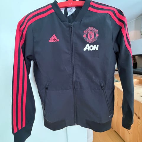 Adidas Manchester United fotballjakke for barn i størrelse S. Jakken er svart med røde detaljer, laget i materiale egnet for sport.