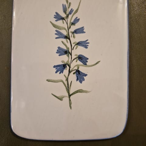 Håndmalt dekor fra Stavangerflint som har produsert fatet på 60-tallet. Design av Inger Waage.