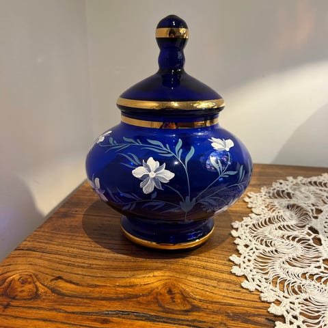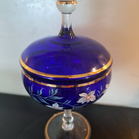 Selger en flott vintage skål med lokk i god stand for kr 300,- Skålen er produsert av Bohemia i Tsjekkoslovakia og den er håndmalt med flott dekor og har striper med ekte bladgull . Skålen har følgende mål : høyden målt fra bunn til topp av lokk er ca 19,5 cm og diameteren målt på det bredeste er ca 14 cm . Den selges som den er og som vist på bildene . Den kan hentes hjemme hos meg eller så kan den eventuelt sendes . 💐 skålen har kun stått til pynt .