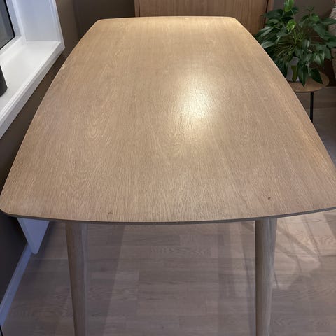 Tungt og stødig spisebord med 2 ileggsplater tilsammen 101 cm ekstra, total lengde 260 cm.