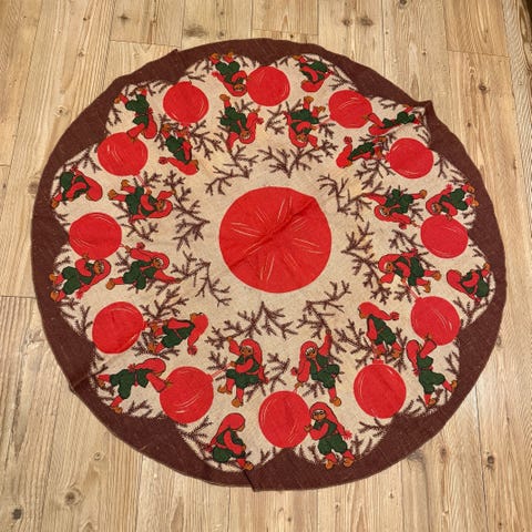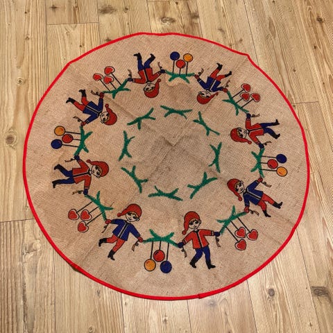 Gammelt juletreteppe av jute / strie med sorte Nisser