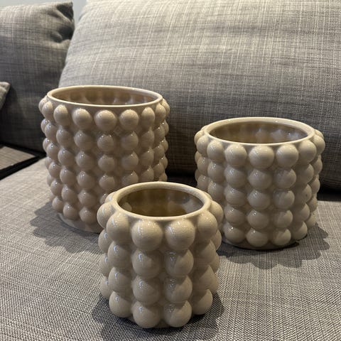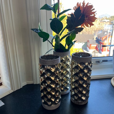 Ingen skår, men diskrete riper i den gullfargede; litt krakelering av glaseringen i bunnen av den hvite bollen; og en liten luftblære i glasskaraffelen.