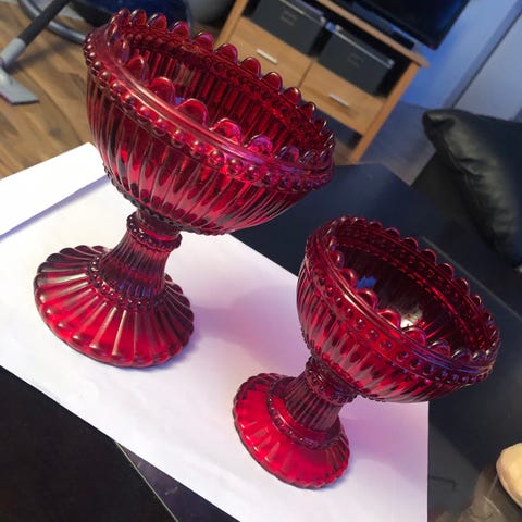 Koselig , pen stettskål i rødt. Absolutt feilfri. Ingen fargeavflassing. Bør nok vaskes for hånd. Ligner på Marimekko sine- men det er nok en kopi. Høyde 15 cm.
