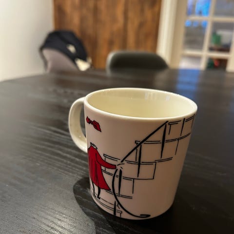 Arabia barnekopp med koselig motiv, i porselen. Koppen har et dekorativt mønster med et hus og trær.