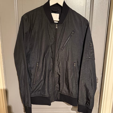 H&M L.O.G.G. jakke i størrelse M for menn. Jakken er svart og laget i lett materiale. Den har glidelås foran, ribbestrikkede mansjetter og krage, og lommer på siden. Passer som ytterjakke for hverdagsbruk.