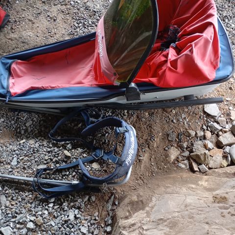 Fjellpulk, som ny, med standard drag kr 5.000, belte kr 500 og drag for hund kr 1.500