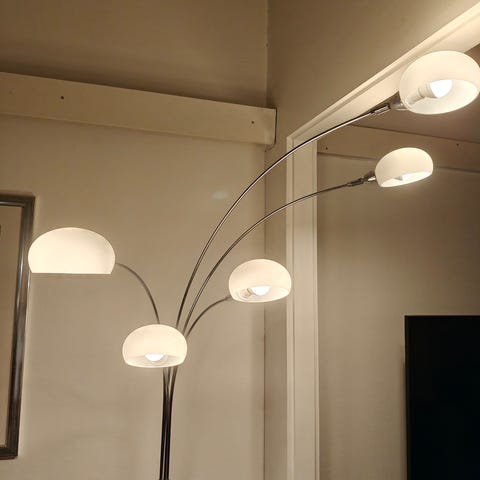 Vakker gulvlampe fra Lampehuset med 5 lys. De dimbare retropærene produserer et varmt lys. Du kan justere vinkelen og retningen på hver lampe separat. Som ny. Leveres med originale pærer, verdt mye ved kjøp separat.