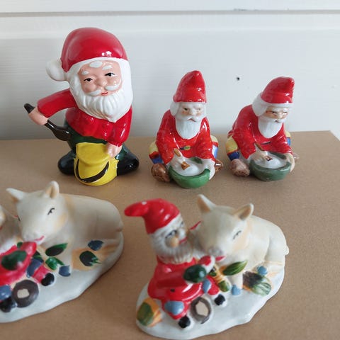3 gamle nisser. Nissene har slitasje og avskallinger. Nisse nr 3 har pålimt lue. De to sittende er 6,5cm høye, den liggende er 9cm lang.