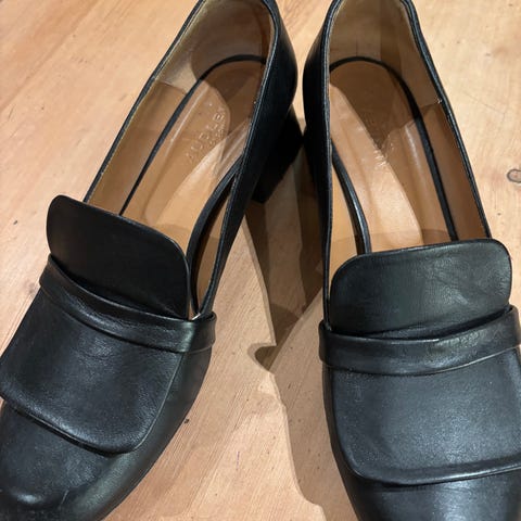 Saueskinnstøfler (str. 40) med broderi og ekte ull inni.