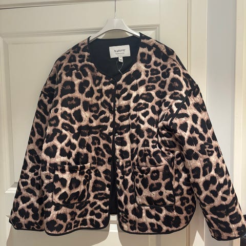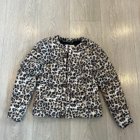 Jakken har leopardmønster med svart innerfôr og lange ermer.