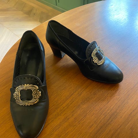 Saueskinnstøfler (str. 41) med broderi og ekte ull inni.