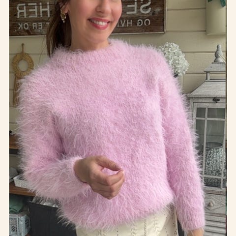 Nystrikket genser str. M/L. Utgangspunkt i Flamingo-genser, men måtte legge til flere border på grunn av tynnere garn en original oppskrift.