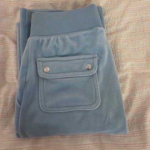 Juicy Couture joggebukser i blå farge, størrelse S for kvinner. Laget av mykt materiale med lommer foran og bak. Passer til fritidsbruk og komfortabelt hverdagsantrekk.
