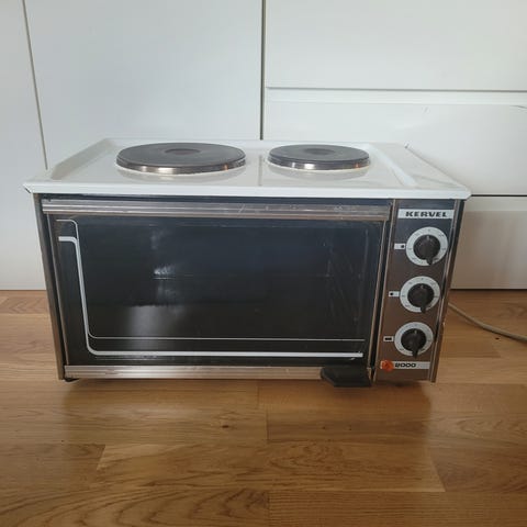Bordkomfyr med to kokeplater. Komfyren er svart og har en ovnsfunksjon med justerbare knotter for temperatur og innstillinger. Passer til små kjøkken eller som ekstra kokeapparat.