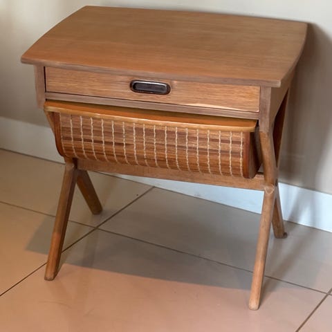 Teak sybord med to skuffer. Noe merker men ellers i pen stand med tanke på alder.