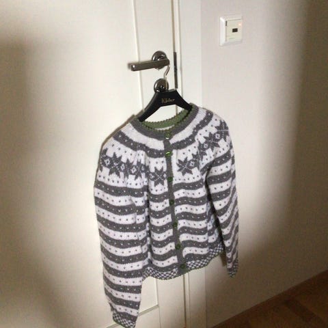 Hjemmestrikket jakke i fargen maisgul selges. Jakken har aldri vært brukt da jeg synest den ble litt liten. Jakken er i str M og er strikket i Gann garn -Dis. 65% mohair, 30% ull og 5 % polyamid. Design: House of Yarn. Overvidde ca 120 cm, hel lengde ca 58 cm og ermlengde ca 45 cm. Jakken har ingen knapper. Kan sendes mot at kjøper betaler porto.
