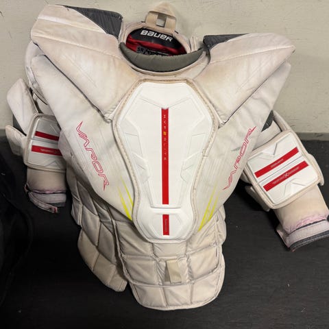 CCM E-Flex 5.9 Ishockey Målvakt Beskyttelse i størrelse S. Beskyttelsen har fargene mørk grå, rød og hvit, og er laget for bruk i ishockey som målvaktsutstyr.